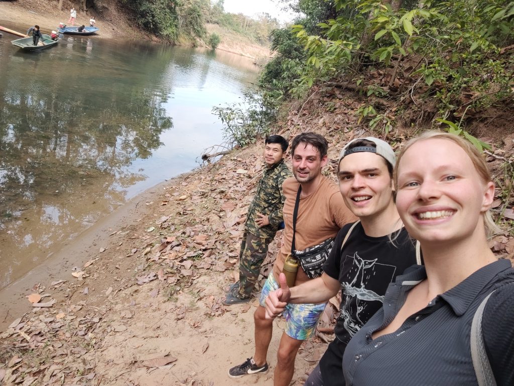 Leider passiert nach rund einer Stunde tatsächlich ein Unglück. Die Dame rutscht aus und stürzt. Uns ist klar, dass sie unmöglich so den restlichen Weg gehen kann. Der Guide hat natürlich kein Handy dabei um Hilfe zu rufen und so machen wir uns alle auf den Rückweg bis Joe endlich wieder Handyempfang hat. Der Guide telefoniert ein bisschen herum und es dauert fast eine Stunde, bis er uns in gebrochenen Englisch versichert, dass ein weiterer Guide zur Hilfe kommt. Ollie erklärt sich bereit, mit der Dame in der Zwischenzeit langsam weiter in Richtung Start zu gehen, während der Rest von uns die Wanderung fortsetzt. Selbst für uns ist es eine der anspruchsvollsten, die wir bisher gemacht haben. Man muss jederzeit voll konzentriert sein und im Nachhinein war es wohl „Glück im Unglück“, dass der Unfall gleich zu Beginn passiert ist. Im weiteren Verlauf wurde es nur noch gefährlicher. Wir wollen uns gar nicht ausmalen, was passieren hätte können, bei einem schwereren Unfall im steileren Gelände. Später erfahren wir, dass die Dame sofort in ein Auto in Richtung Vientiane zu einem Krankenhaus gesetzt wurde. Also irgendwas zwischen 6 und 8 Stunden Autofahrt. Ein Hoch auf das Gesundheitssystem bei uns zu Hause.